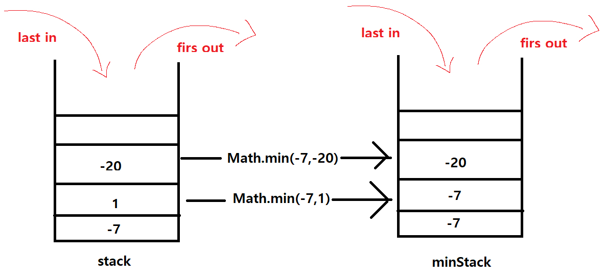 push()할 때 stack과 minStack에 배열에 각자 역할이 다른 데이터들이 저장하게되고